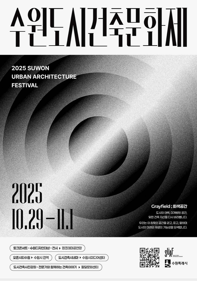 ○ 기 간: 2025. 10. 29.(수) ~ 11. 1.(토) [4일간] ○ 장 소: 정조테마공연장, 수원시미디어센터, 팔달문화센터 등 ○ 프로그램: 오픈시티수원, 토크콘서트&수원디자인대상 시상식, 도시건축 시네마, 도시건축 사진강좌, 전문가와 함께하는 건축이야기, 전시(대학생 국제워크숍 작품전, 건축사 사진전) ○ 종합안내: https://litt.ly/suaf.kr