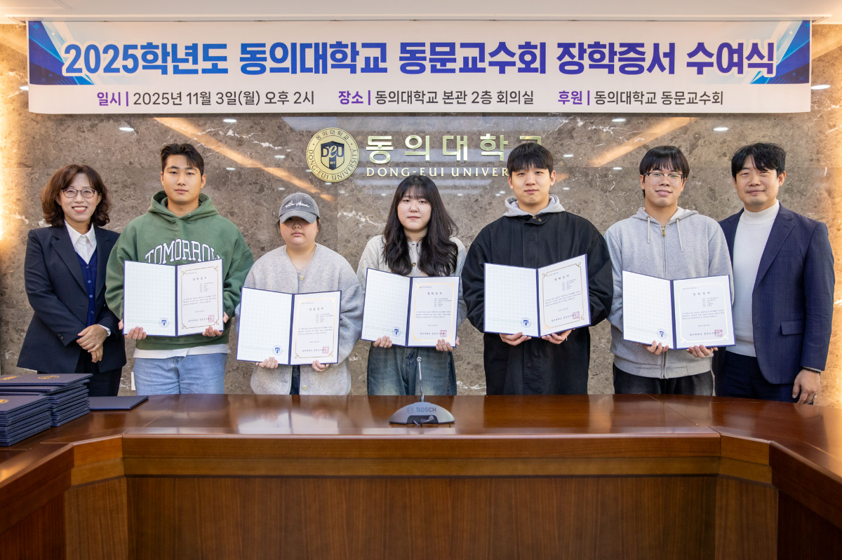 동문교수회 김찬용 회장님께서는 "교수이기 이전에 선배로서 후배들을 위한 장학금을 지원하게 되어 더욱 뜻깊다"며, "선배들의 내리사랑을 이어받아 항상 베푸는 동의인이 되기를 희망한다"고 전하셨습니다.