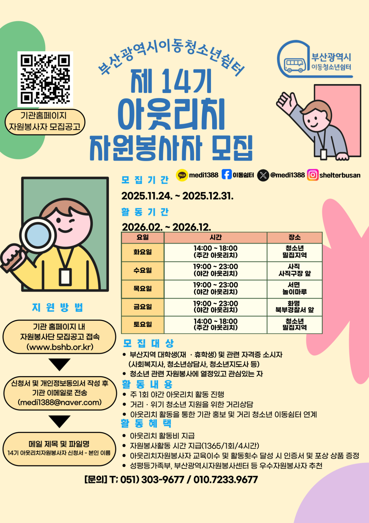 부산광역시이동청소년쉼터 14기 아웃리치자원봉사단 모집 안내