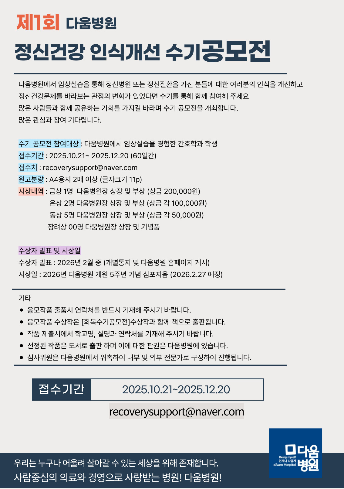 제1회 다움병원 정신건강 인식개선 수기공모전 안내